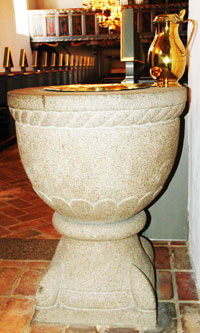 Granitdøbefont (signeret B.J.1914) efterligner den romanske Thybo-type.