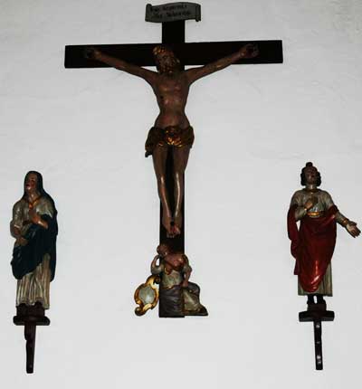 Krucifiks med sidefigurer, nævnes som korbuekrucifikset, nu er det placeret på skibets nordvæg.