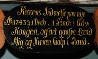 | I C.E.C.Gad står der, at i 1929 fremdroges naive kalkmalerier, ornamentslyng og draperier, sikkert fra 1742, det må vel være de her omkring korbuen, som i øvrigt på et tidspunkt bliver fundet stærkt ildskørnet. |